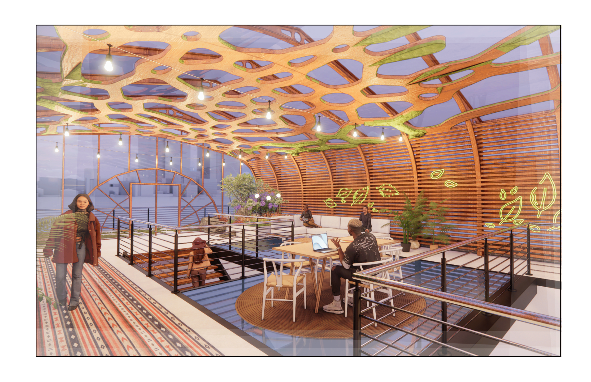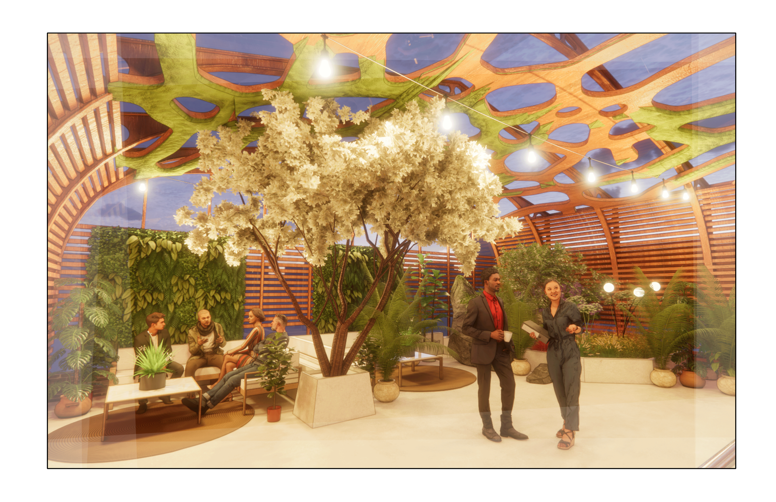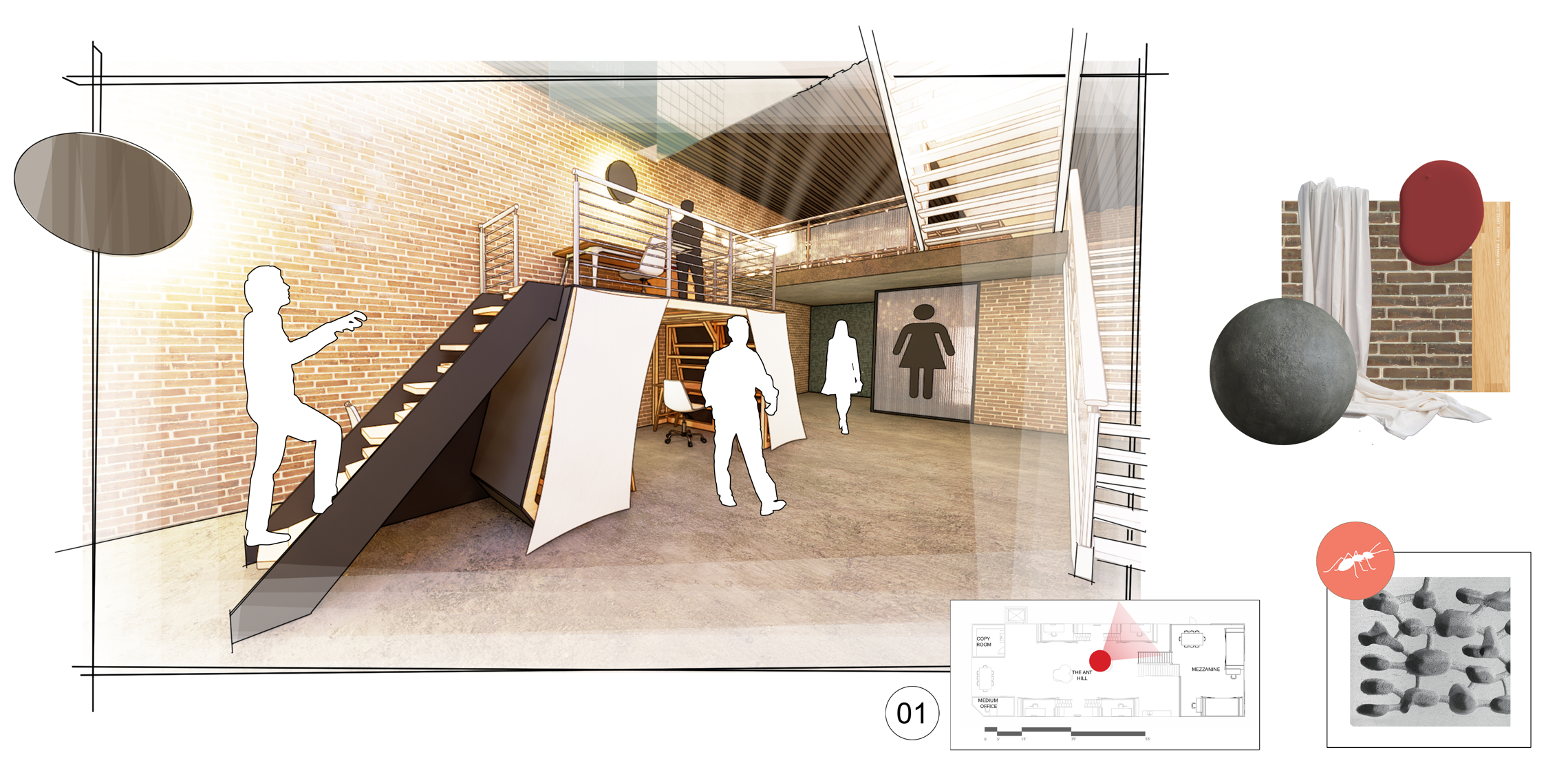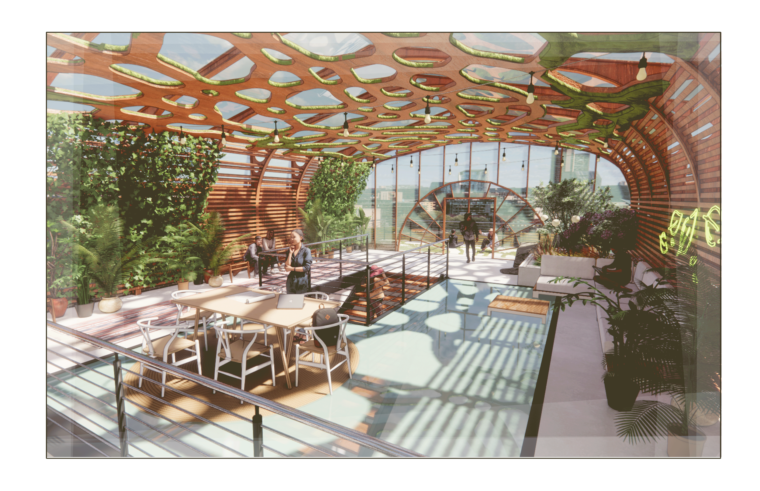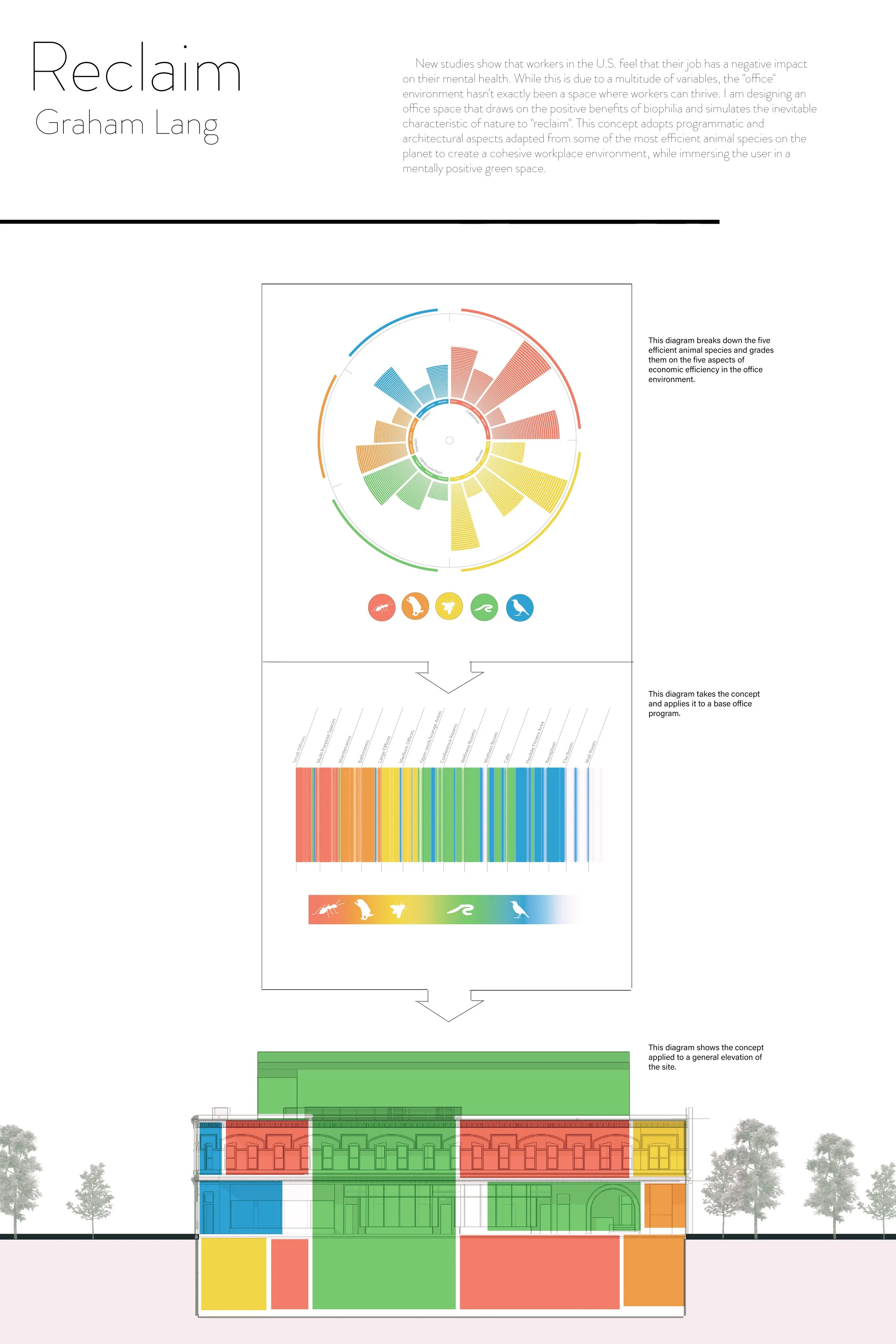 New studies show that workers in the U.S. feel that their job has a negative impact on their mental health. While this is due to a multitude of variables, the "office" environment hasn't exactly been a space where workers can thrive. I am designing an office space that draws on the positive benefits of biophilia and simulates the inevitable characteristic of nature to "reclaim". This concept adopts programmatic and architectural aspects adapted from some of the most efficient animal species on the planet to create a cohesive workplace environment, while immersing the user in a mentally positive green space.